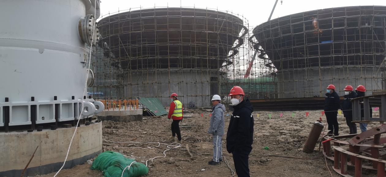 20221230日上午,在即將迎來2023年新年之際,興華科技公司聯堿裝置區建設現場正呈現一片火熱的安裝景象,聯堿最重要的核心設備之一碳化塔,迎來了隆重的安裝典禮,公司總經理卓士彬、副總經理潘杭軍、朱愛民等主要領導親臨現場,見證了這一令人激動的時刻。8:48分,安裝現場鞭炮齊鳴,建設單位向卓士彬總經理匯報一切準備就緒之后,隨著卓總的一聲令下, 1800噸和1350噸吊車相互配合,重達300多噸的碳化塔被緩緩吊起,聯堿項目部李志經理親自把關設備方位、標高、找正等技術關鍵點,確保一次準點到位,經過1個多小時的調整,第一臺碳化塔穩穩得座落在設備基礎之上,經過公司能源動力部、項目部、監理單位以及施工方多次反復確認,確保碳化塔精準無誤地落在基礎上面,圓滿安全地完成了第一臺碳化塔起吊安裝工作,標志著興華科技聯堿設備安裝開始進入一個新的高潮。目前聯堿整個設備安裝預計在元旦和年后即將全面鋪開,為項目建設如期開工,興華科技公司全體員工都在全力拼搏。